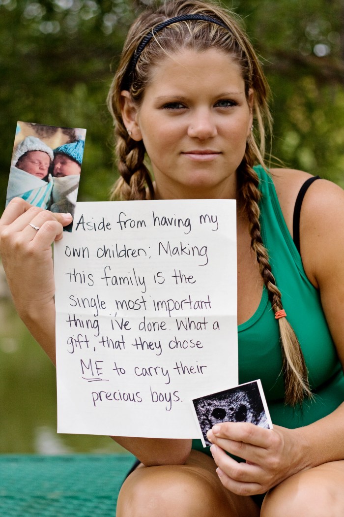 My Mom always called me Fertile Mertyl because I get pregnant and carry babies so easily. When my brother and his wife were having trouble having a baby my sister in law joked that she should pay me to carry a baby for her…so I started researching and discovered that surrogacy was a feasible option. That was something I was willing to do for them. I offered, but was told that she REALLY wanted to carry the baby herself. However, I really felt a calling to this….So I signed up with an agency, found the most amazing couple who had been waiting such a long time to find someone who was willing to carry their baby. And I signed all the papers and took all the tests and after a year and a half and 37 difficult weeks delivered two of the most beautiful baby boys. It was such a blessing to be able to create this family. To give children to people who cherish them so much.